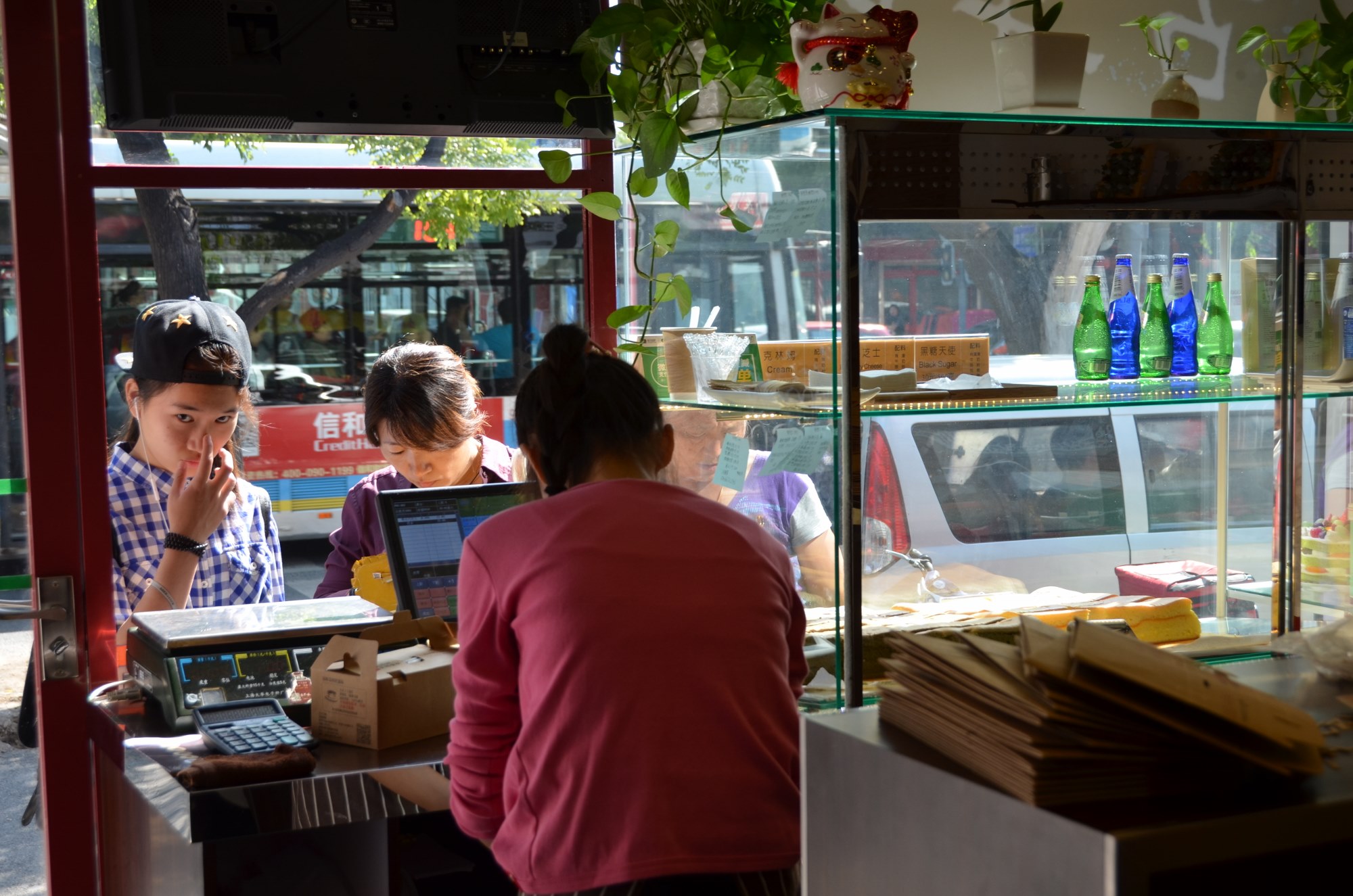 Quando passamos, pela manhã e à tarde, temos nossa turminha para o nihao: a moça da padaria onde comemos hoje, a dona e a garçonete do restaurante em que comemos dumplings 3 vezes (delicioso!), o pessoal do mercadinho onde compramos água, o cara da conveniência que sempre vende a última cerveja do dia – e que sempre abre a garrafa de 500 ml para virmos caminhando até o hostel e bebendo.