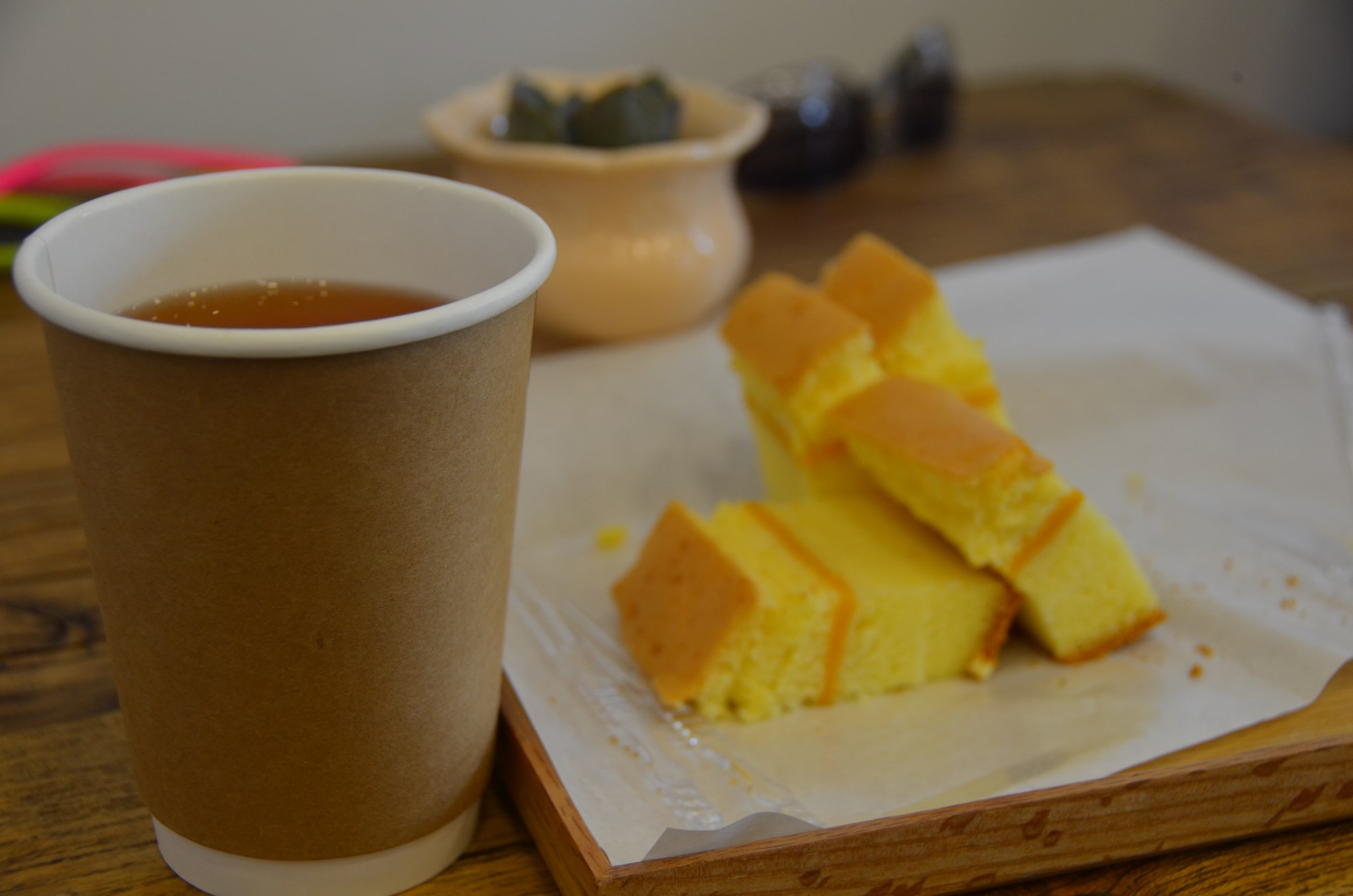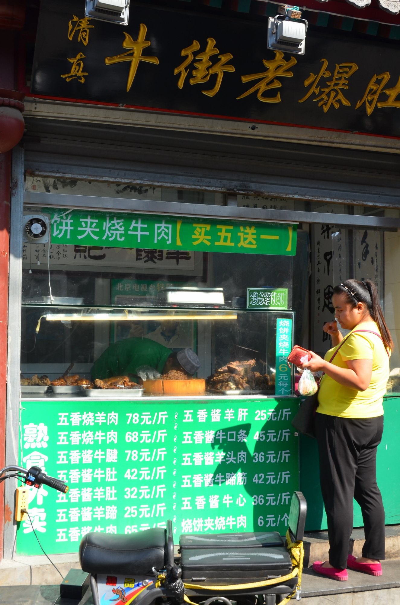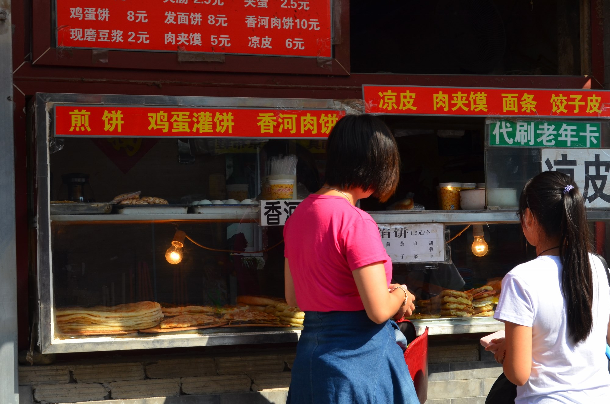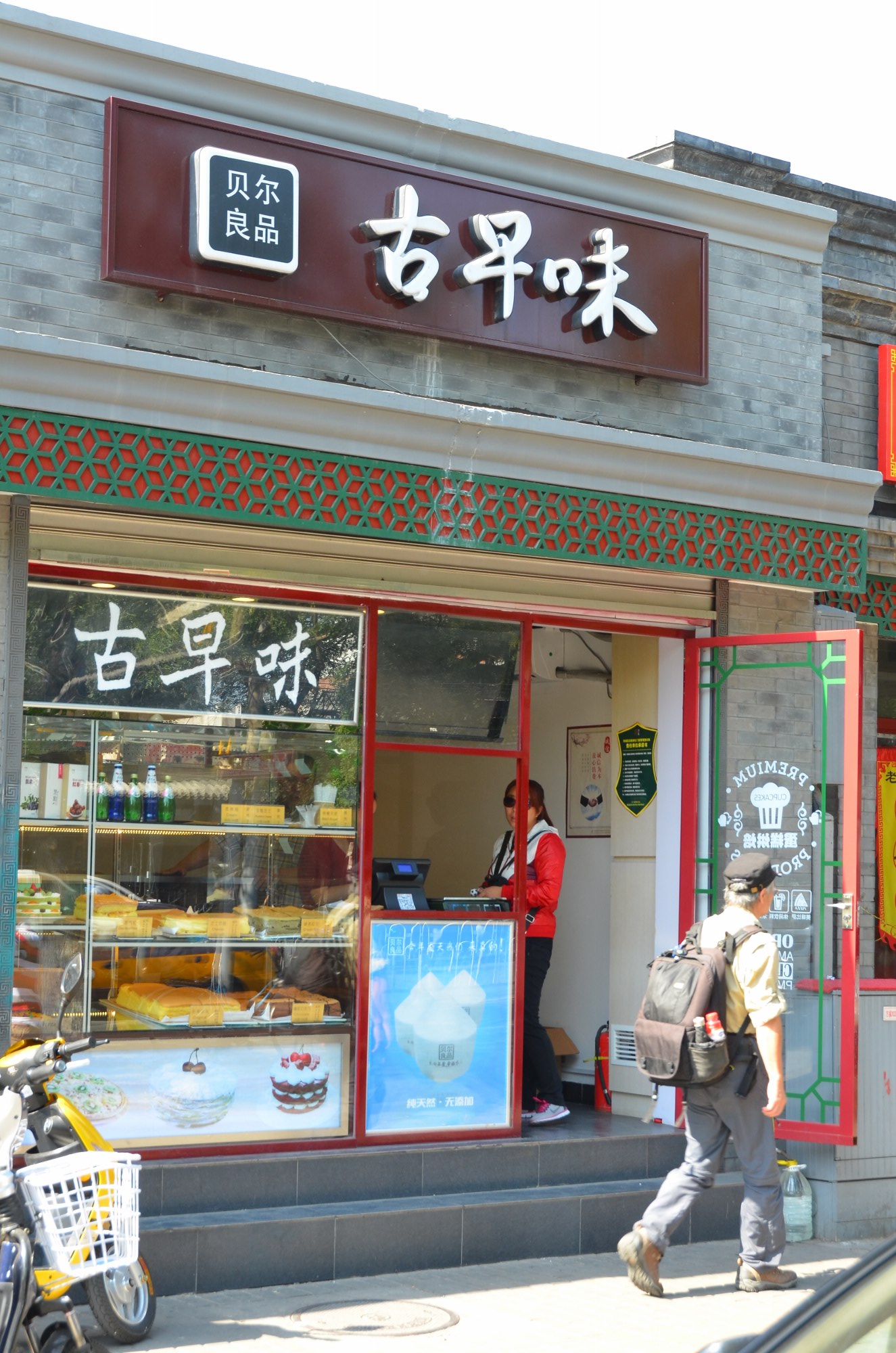 Hoje, antes de sair para o Museu Nacional da China, paramos pela primeira vez num buraco que é uma das padarias da saída do hutong. Eles têm mesinhas lá dentro, mas também atendem quem passa por uma janela que dá para a rua. 7 dias, e é a primeira vez que compramos algo ali. Nossa surpresa: um bolo fofinho, delicioso. Um chá vermelho no ponto. Um café da manhã por 24 yuan para três.